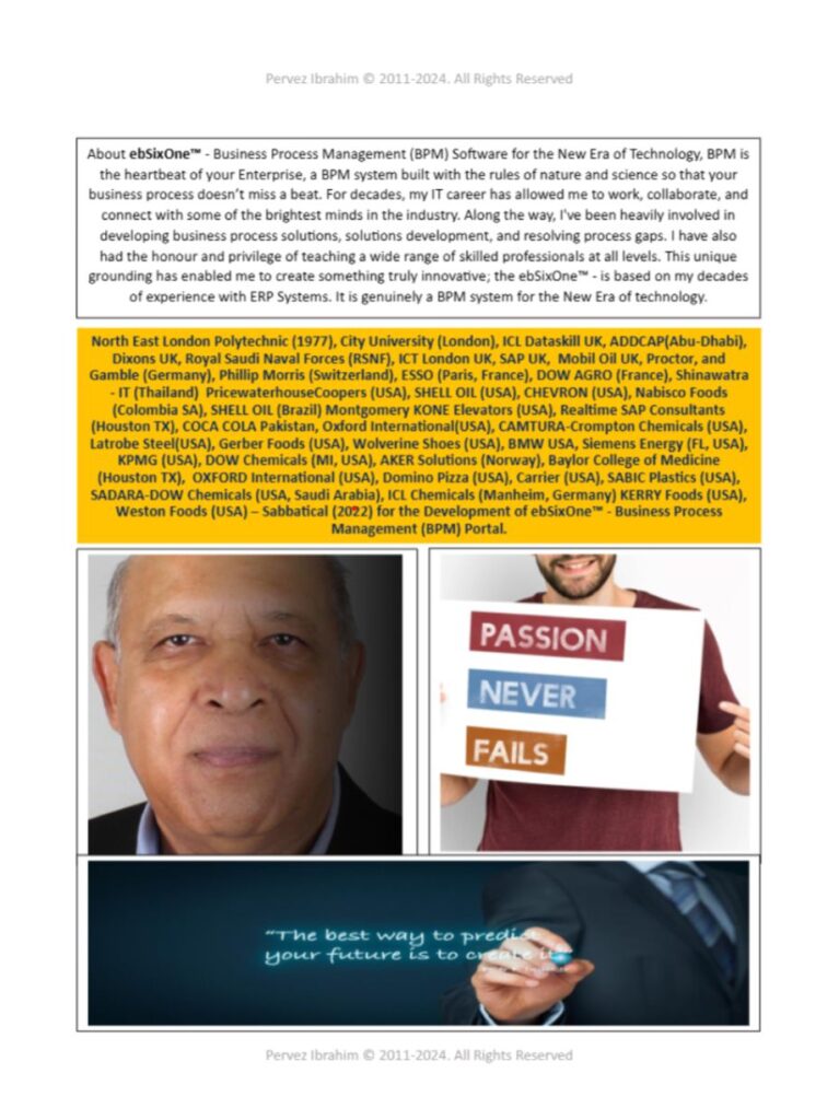 My name is Pervez Ibrahim, and I have developed ebSixOne™, a Business Process Management (BPM) software.